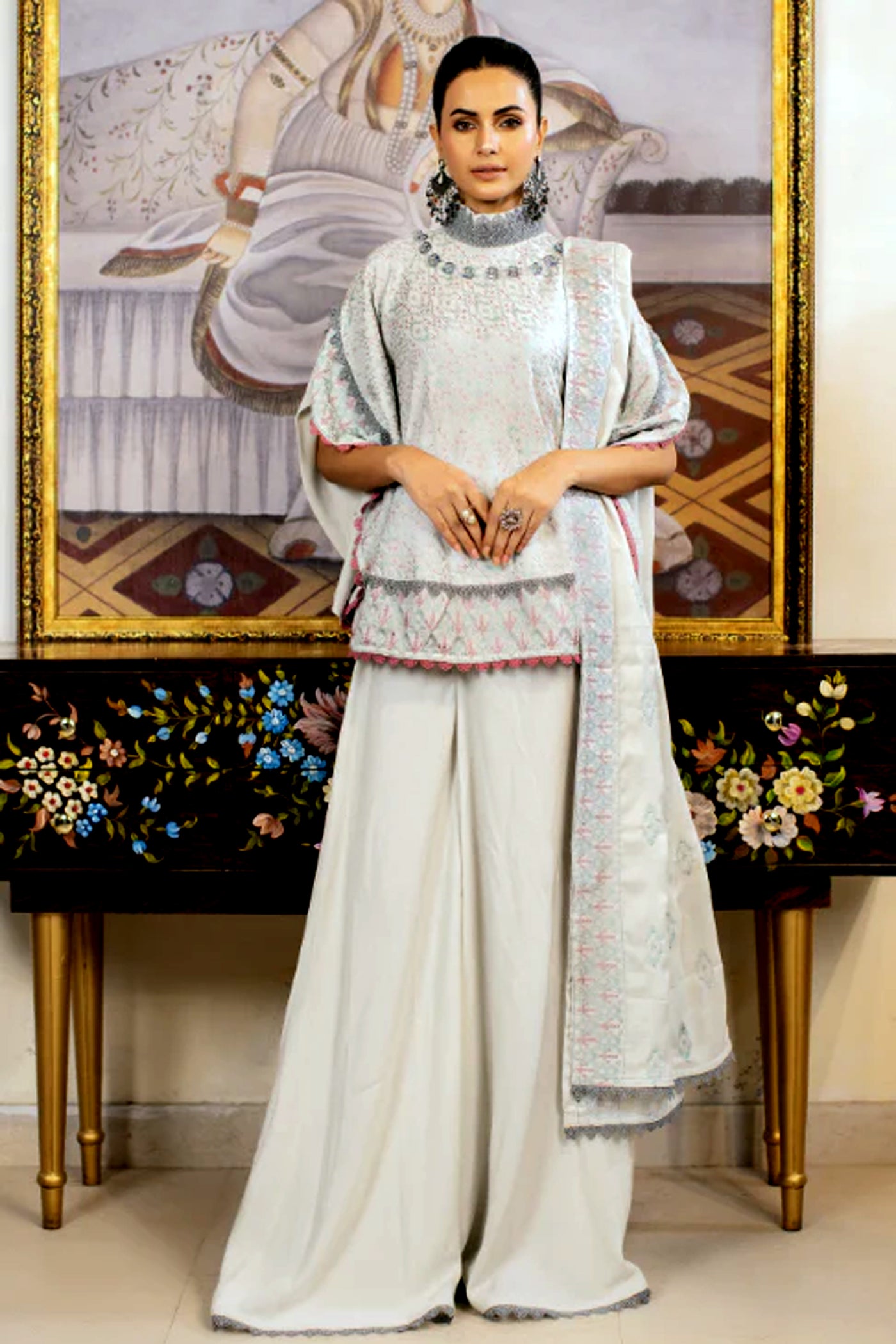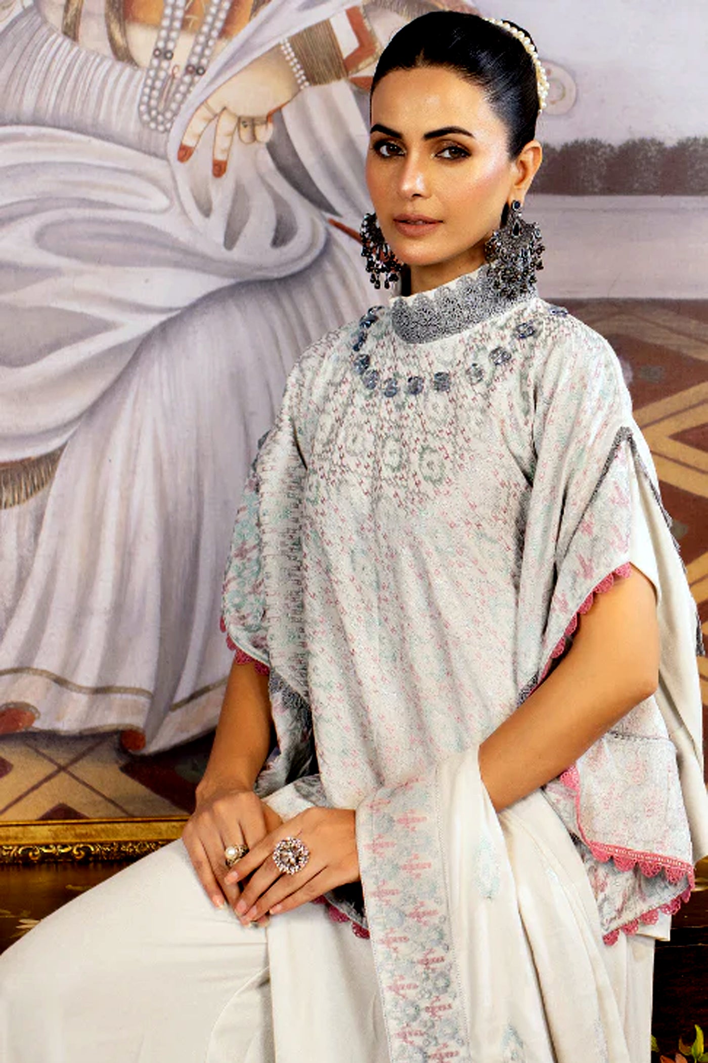 3Pc Unstitched Peach Embroidered Shirt with Wool Embroidered Shawal