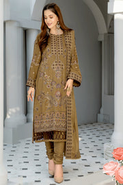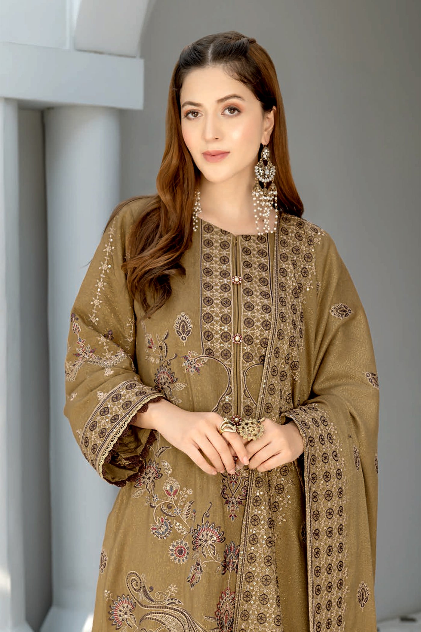 3pc unstitched peach zari embroidered shirt with wool zari embroidered shawal
