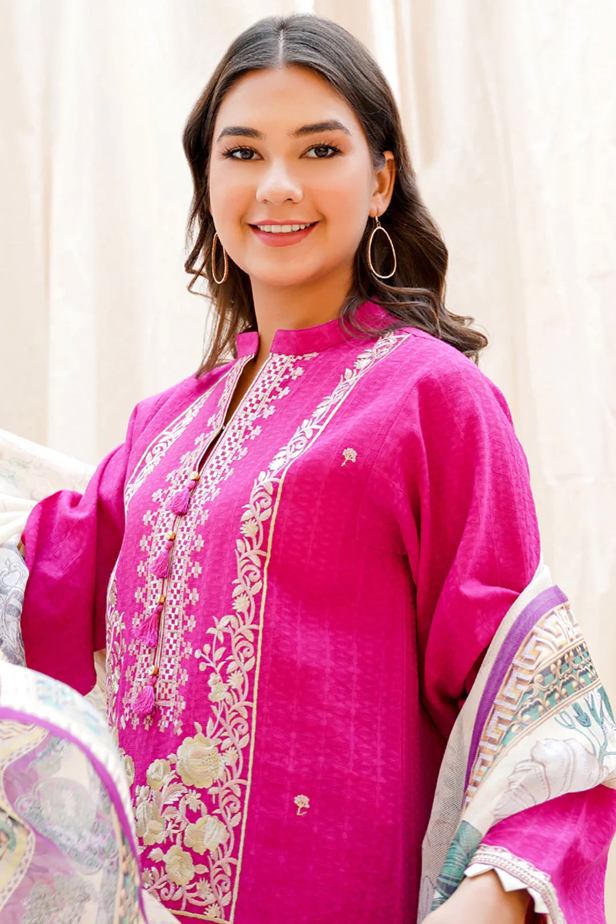 oriental border and motifs. Vibrant pink color and borders this 2 piece suit is matched with a khaddi net dupatta.